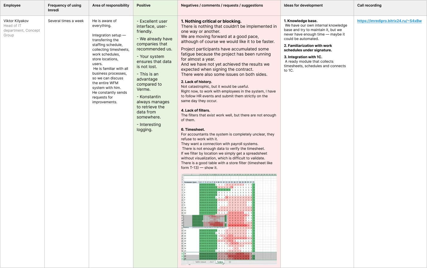 Not enough info about employees and hour limits, unclear table and link action patterns, no planned vs actual hours comparison